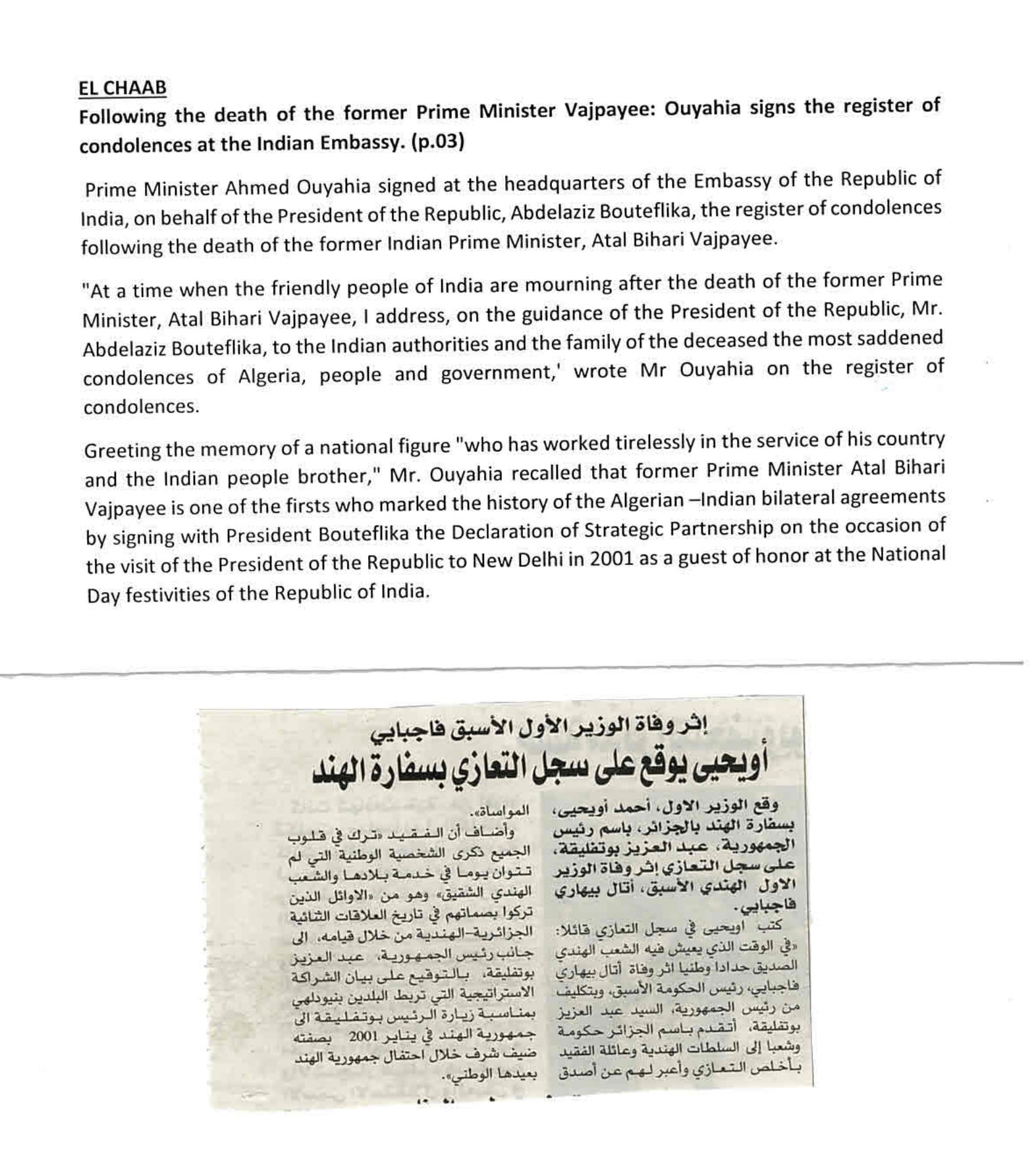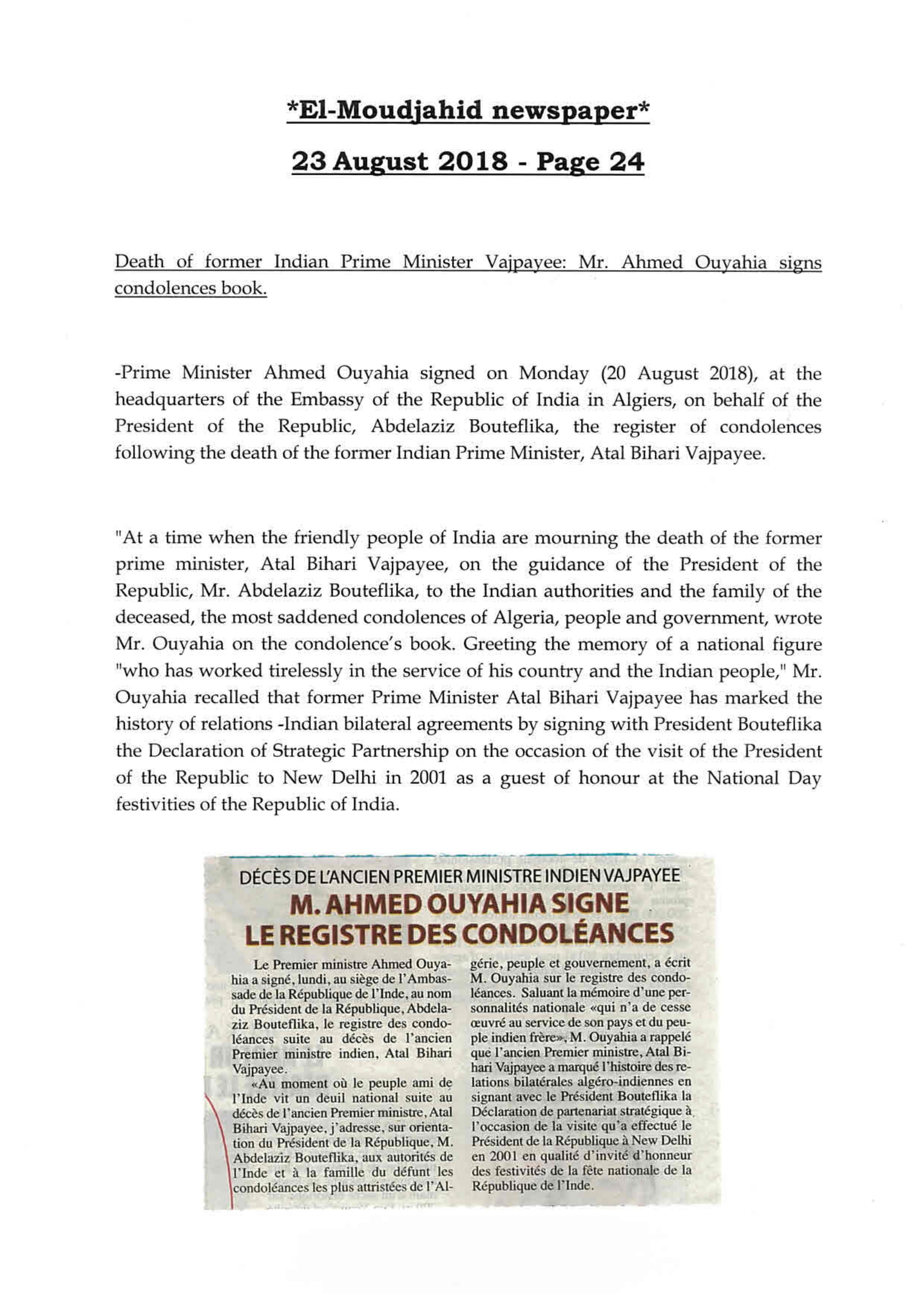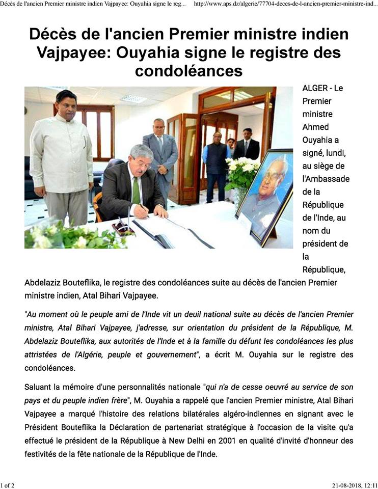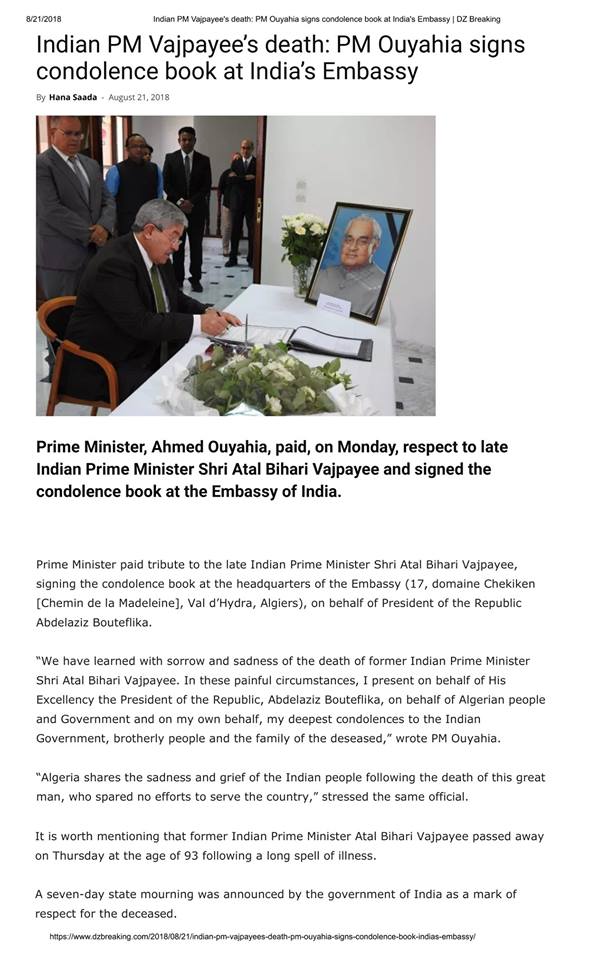 Algerian Prime Minister pays tribute to Late Prime Minister Shri Atal Bihari Vajpayee and signs condolence book at the Embassy
