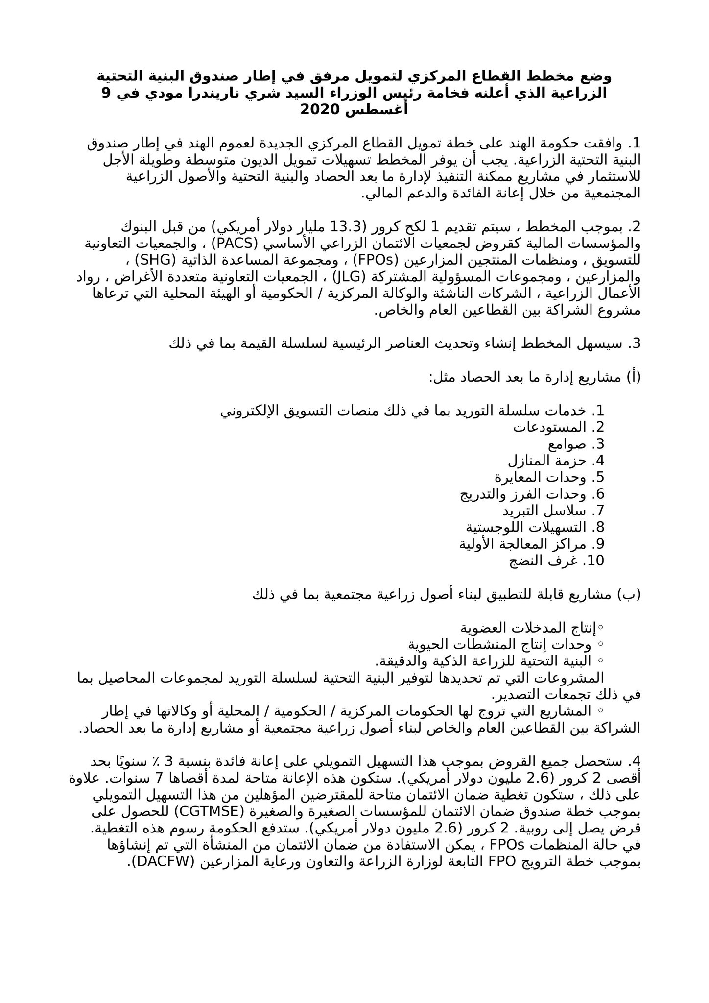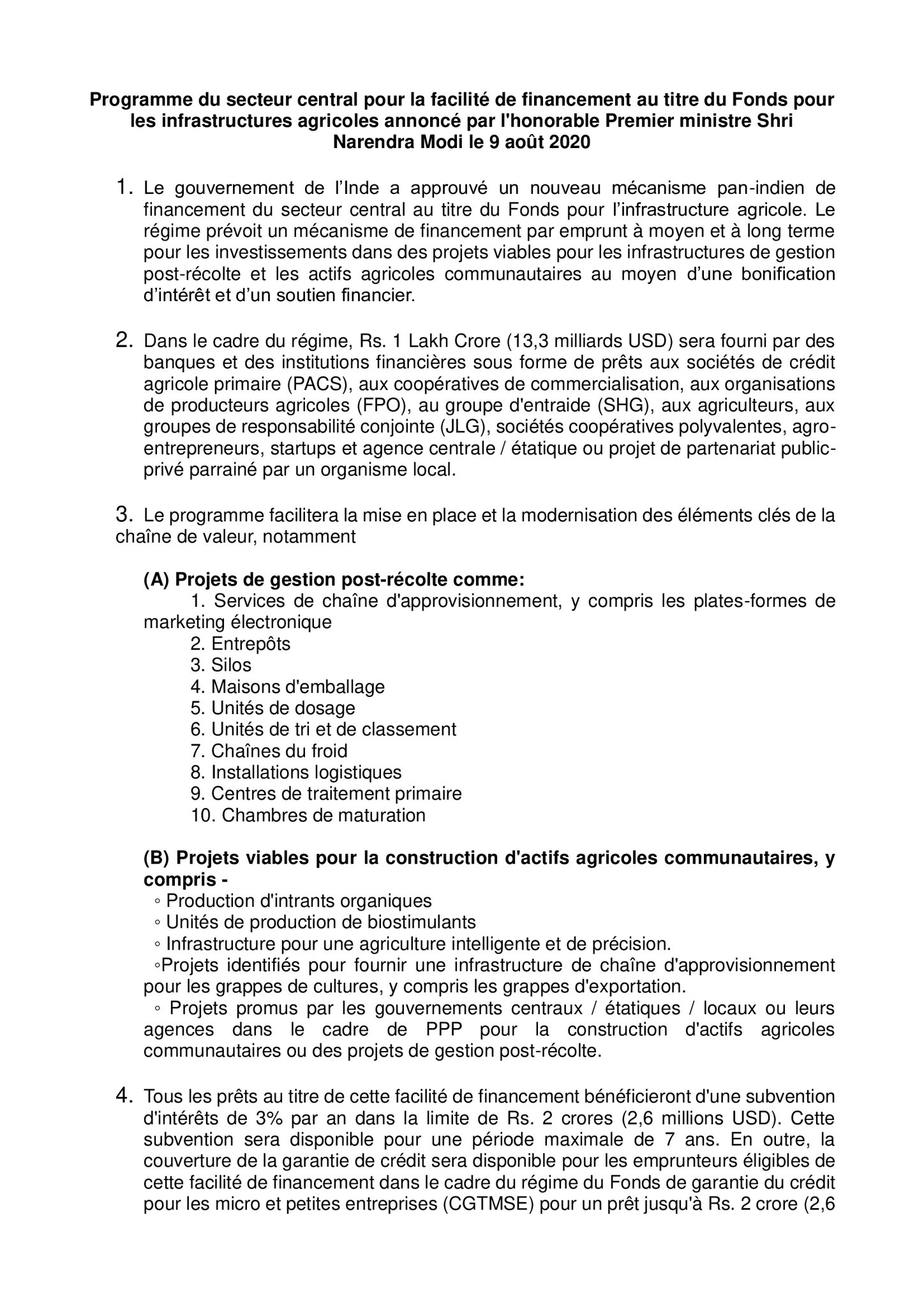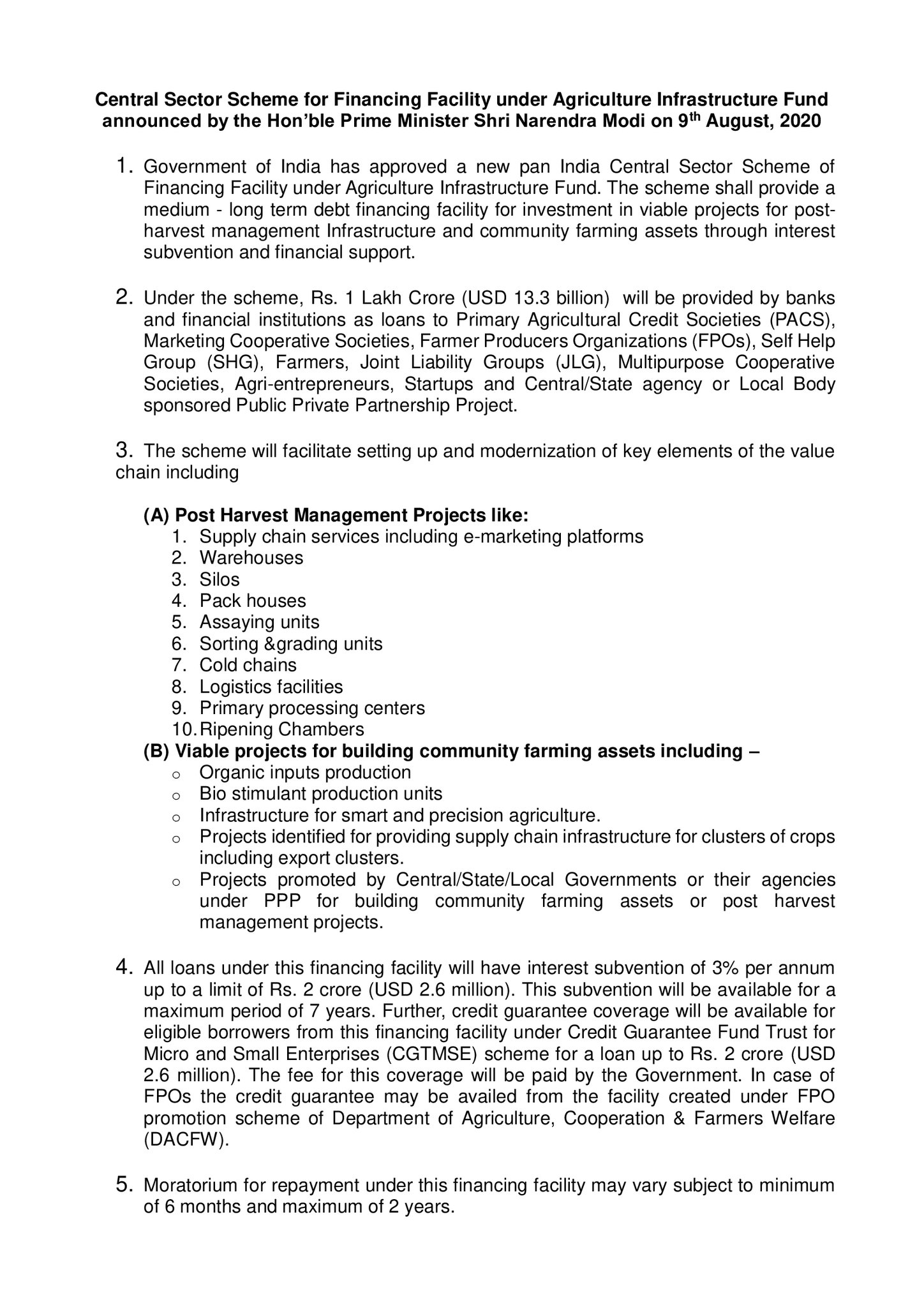 Central Sector Scheme for Financing Facility under Agriculture Infrastructure Fund announced by the Hon’ble Prime Minister Shri Narendra Modi on 9th August, 2020
