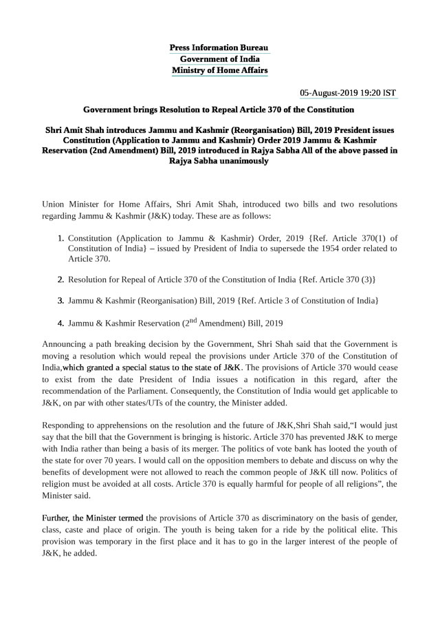 Government brings Resolution to Repeal Article 370 of the Constitution