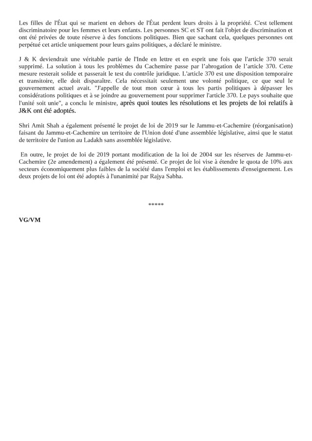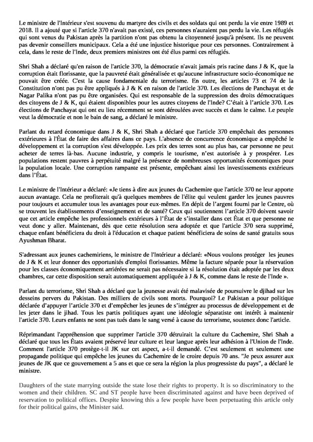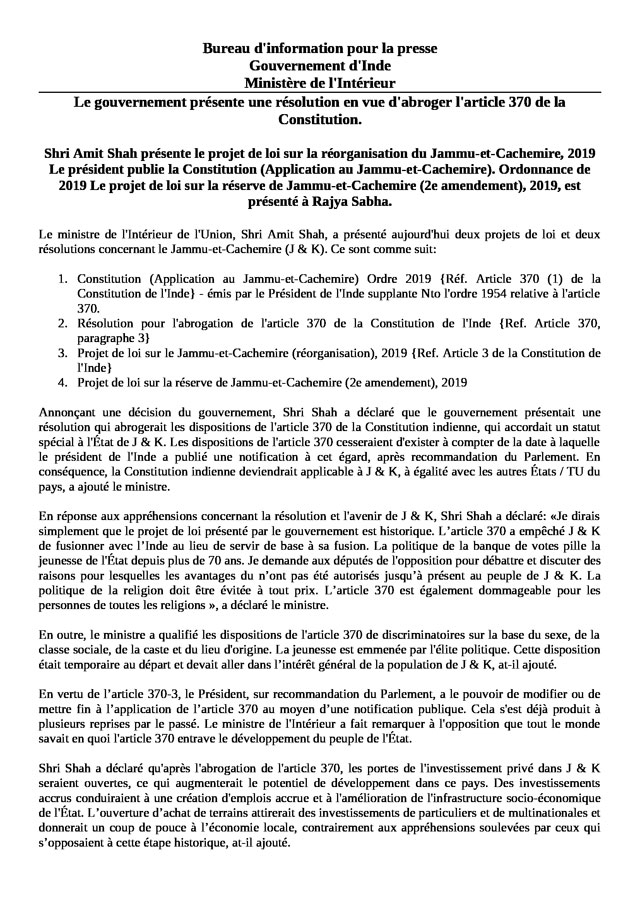 Le gouvernement présente une résolution en vue d'abroger l'article 370 de la Constitution