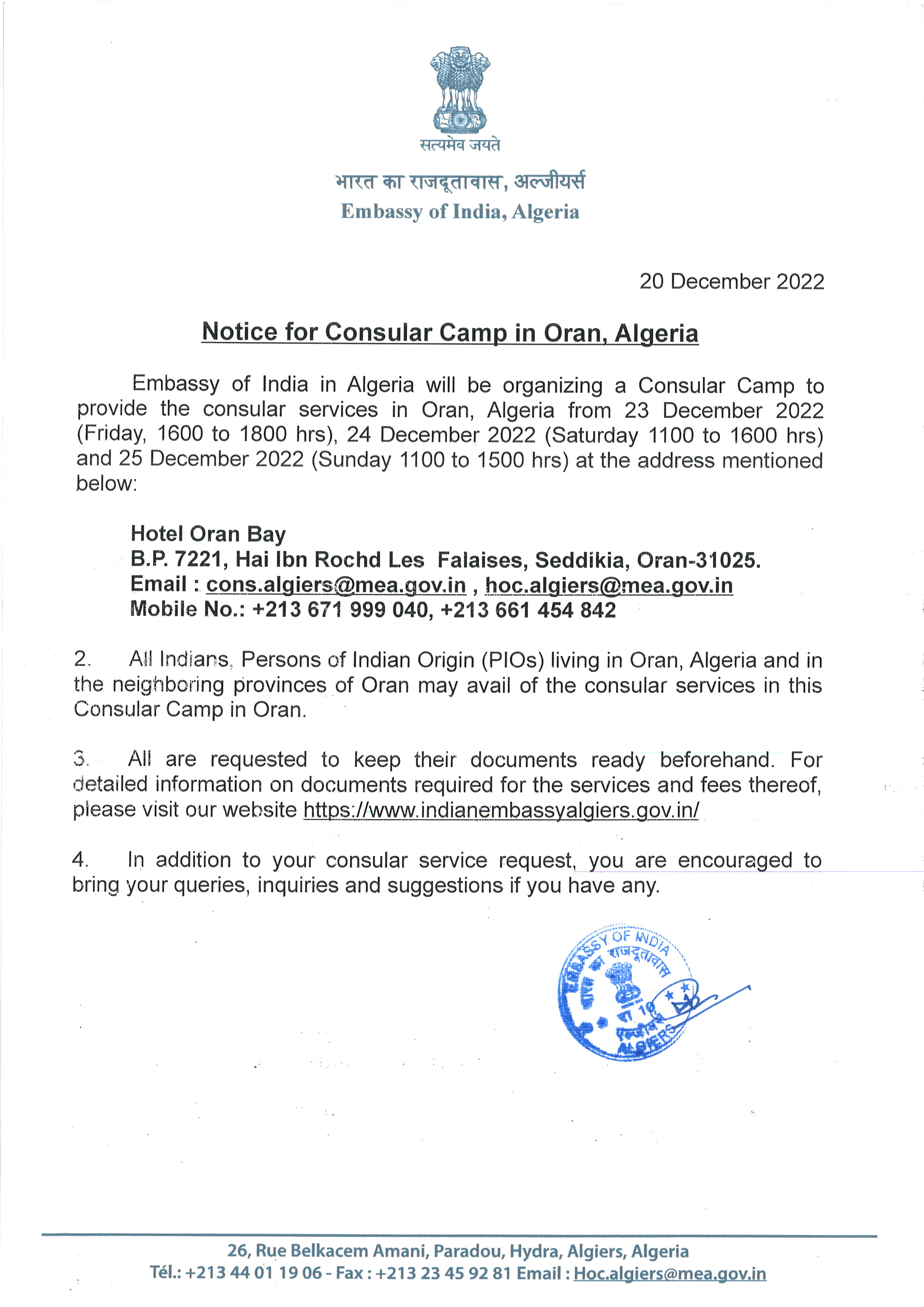 Notice for Consular Camp in Oran, Algeria (23-25 December 2022)