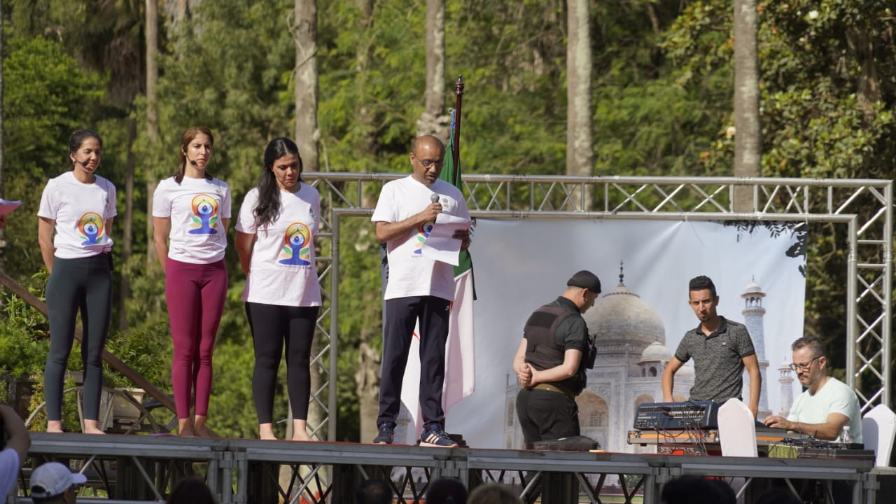 3. Deputy Director Mr. Goufi Zinedine from Ministry of Foreign Affairs and National Community Abroad of Algeria graced the celebration and participated in the Yoga session. Well known Algerian athlete Ms. Hassiba Boulmerka, specializing in middle-distance races of 800 meters and 1500 meters; Mr. Abderramane Moreceli, former Olympian specialist in middle-distance running; Mr. Khaled Benaissa,  Algerian actor and his spouse Ms. Samia Meziane, Algerian actress; Ms. Souha Oulha, Algerian Actress and Hayet Dakou, Social Media influencer also attended the event .