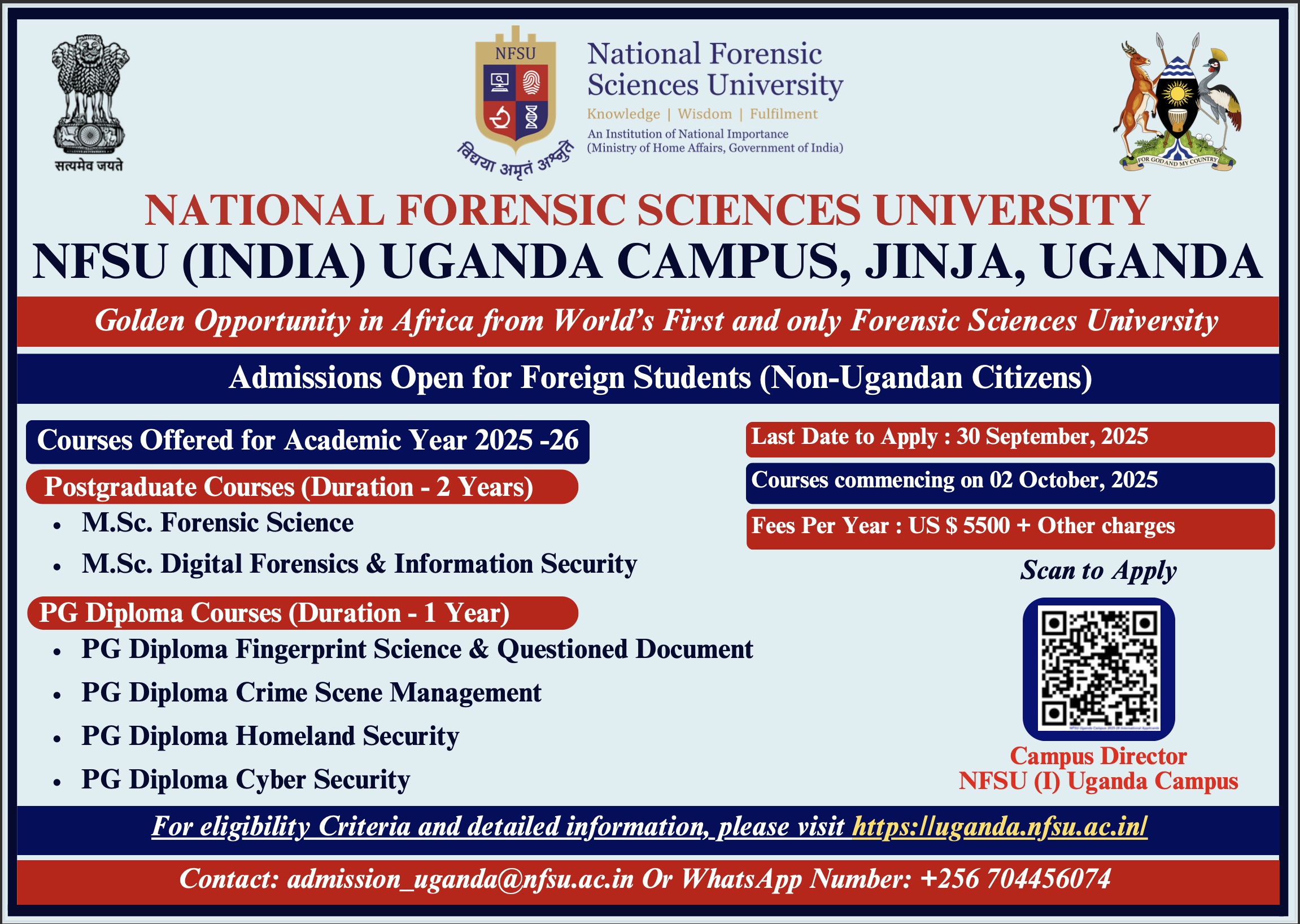 Scan QR Code to Apply! : https://uganda.nfsu.ac.in : admission_uganda@nfsu.ac.in